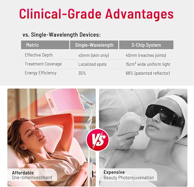 DUAL WAVELENGTH TECHNOLOGY This advanced red light therapy device combines 660nm red light and 850nm near-infrared light to deliver powerful, deep-reaching benefits for pain relief, muscle recovery, and skin rejuvenation. Featuring 120 high-performance LEDs (1 visible red + 2 invisible infrared per group), it provides optimal light absorption for faster, more effective results.